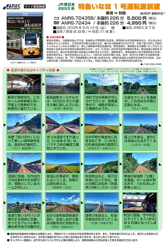 JR東日本 E653系特急いなほ1号運転席展望 新潟 ⇒ 秋田 4K60P撮影作品【BD】 [ANRS-72435B]