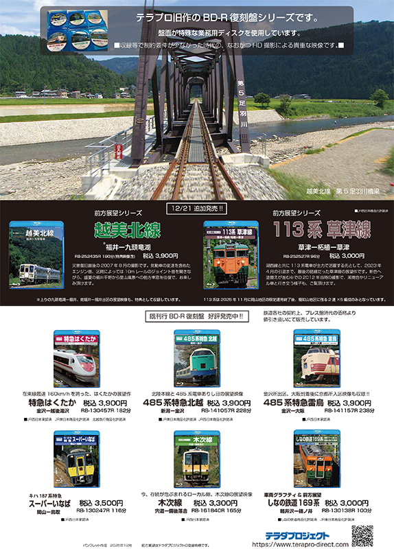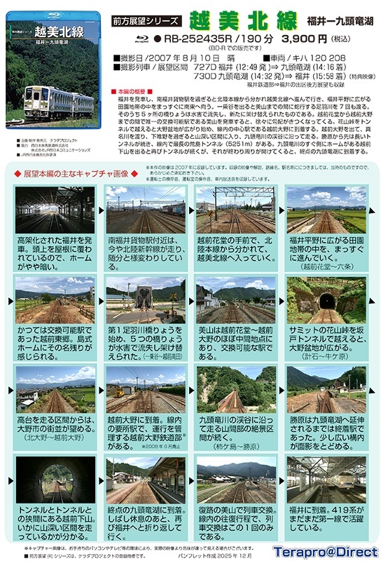 本作は越美北線が水害から復旧を遂げたばかりの 2007 年8月に撮影。福井駅から九頭竜湖まで、里山と秘境風景が続く同線の前方車窓を往復収録。DVD盤の刊行以来、18年ぶりに※ブルーレイディスクでの提供製品となります。